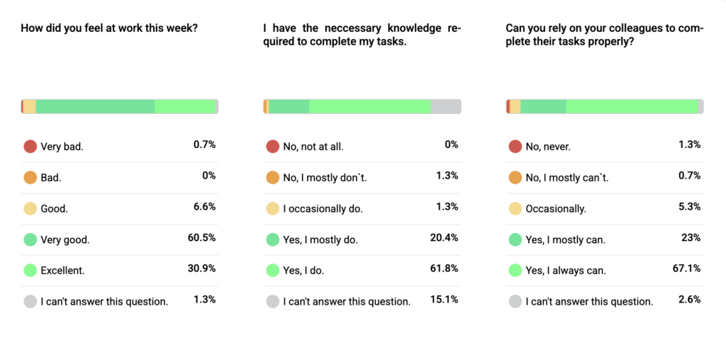 Employees receive the same first question, related to well-being, every week, which helps track trends over time. The other questions rotate and cover engagement, performance, culture, and how people feel at work. Because the surveys are short, people actually complete them instead of ignoring them.