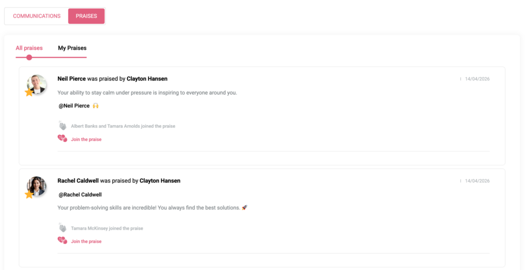 Instead of staying private, recognition appears on a shared “praise wall” where others can see it, react to it, and even join the same recognition. That turns a single moment of appreciation into a cultural signal that spreads across teams.